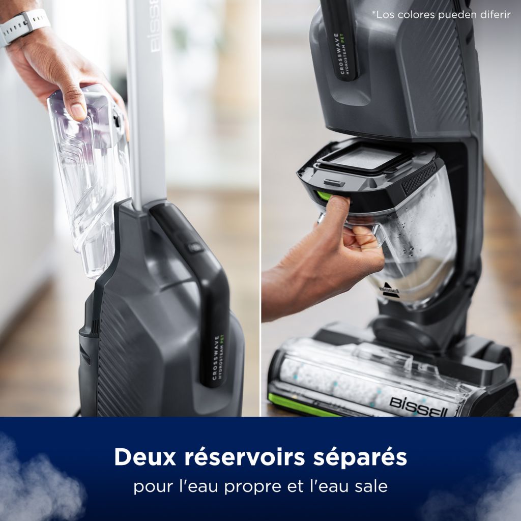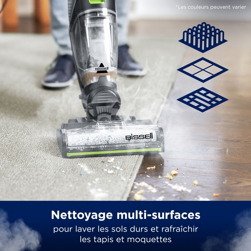 Le BISSELL CrossWave HydroSteam Pet Select est un nettoyeur multi-surfaces 3-en-1 qui aspire, lave et sèche en un seul passage. Grâce à la technologie HydroSteam™ et au mode vapeur à la demande, il élimine efficacement les saletés collantes et les traces tenaces sur les sols durs et rafraîchit également les tapis.