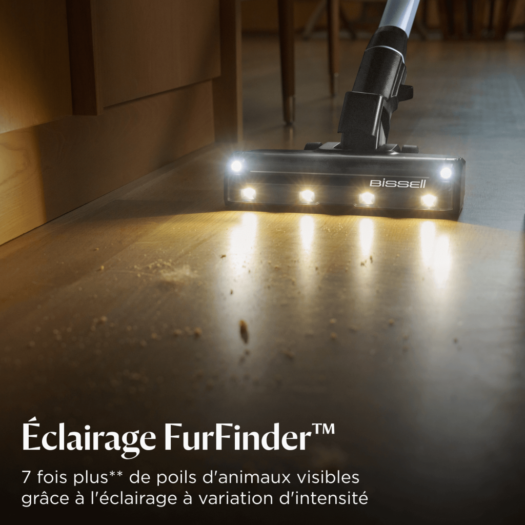 Le BISSELL PowerClean FurFinder Select capture efficacement les poils d’animaux grâce à sa technologie FurFinder Headlight qui révèle les débris invisibles. Puissant, sans fil et 3-en-1, il nettoie sols, tapis et tissus avec jusqu’à 40 minutes d’autonomie, une filtration HEPA avancée et une brosse anti-emmêlement.