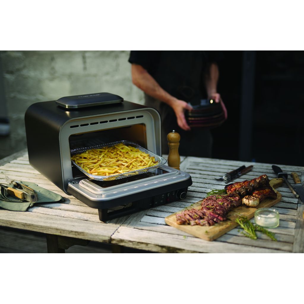 Son design noir mat s’intègre aussi bien dans une cuisine moderne qu’en extérieur. Conforme à la norme IPX4, il peut être utilisé aussi bien en intérieur qu’en extérieur. La porte à triple vitrage avec joint périphérique garantit une excellente isolation thermique pour une cuisson homogène et économe en énergie.